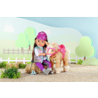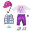 Voor een dag in de manege heeft de kleine paardrij-ster de juiste outfit nodig: een paardenshirt met lange mouwen, een bodywarmer om warm te blijven tijdens de rit, een paardrijbroek en rijlaarzen om veilig in het zadel te blijven zitten. Natuurlijk is een geschikte helm een must. Ook aan het paard van BABY born is gedacht: accessoires zoals een zweepje en een roskam voor het borstelen zijn ook inbegrepen. De outfit past ook BABY born Sister en andere poppen van 43 cm.