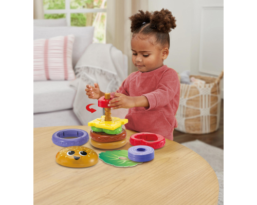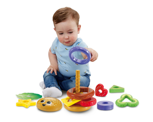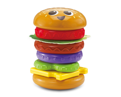 Tijd voor een burger met een flinke portie speelplezier! Stapel en draai alles op deze hamburger en maak kennis met verschillende etenswaren, vormen en kleuren. Het plaatsen van de vormen en etenswaren draagt bij aan de ontwikkeling van de motoriek en stimuleert de tastzin. Wie heeft er trek om te leren?