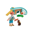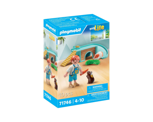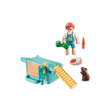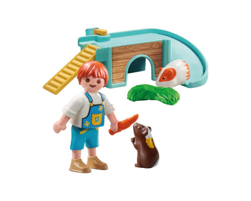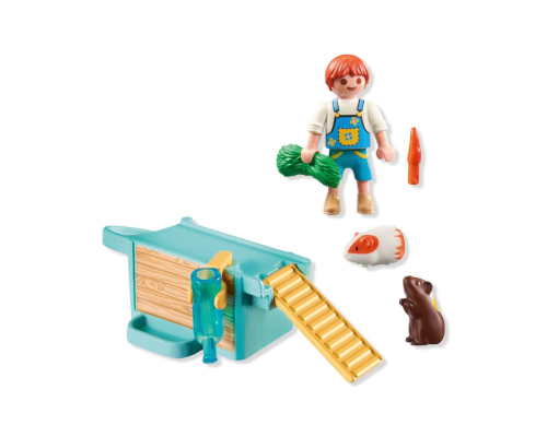 De jongen zorgt liefdevol voor zijn twee cavia's.