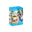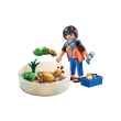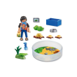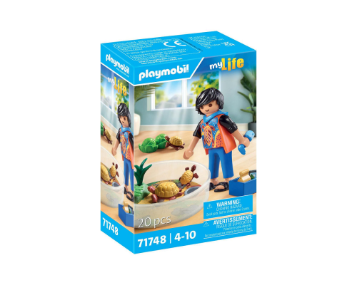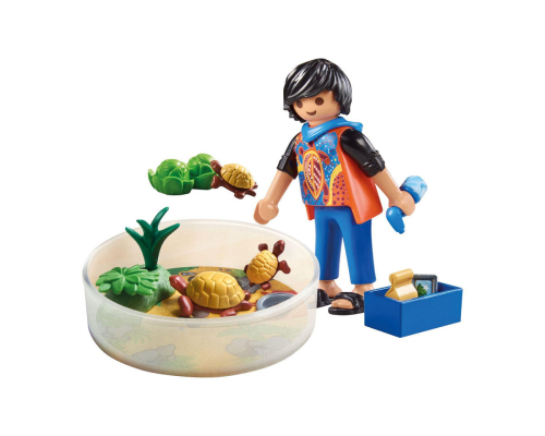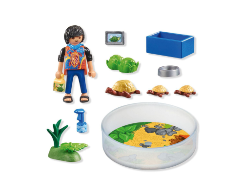 De dierenverzorger zorgt voor de schildpad en haar baby's, die in een terrarium zitten dat bij de soort past.