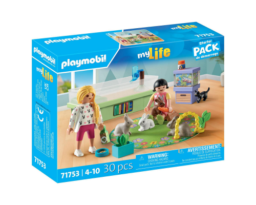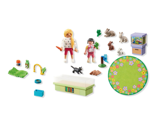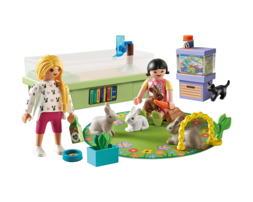 De konijnenfamilie is vandaag de tuin aan het verkennen. Ze hebben genoeg eten en water in hun verblijf. De konijnen voelen zich ook helemaal thuis bij hun buren, de kleine kat en de kleurrijke vissen in het aquarium.