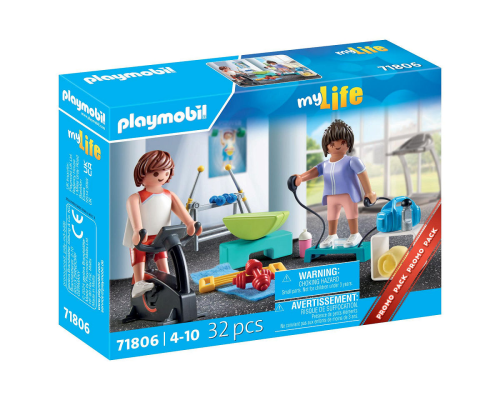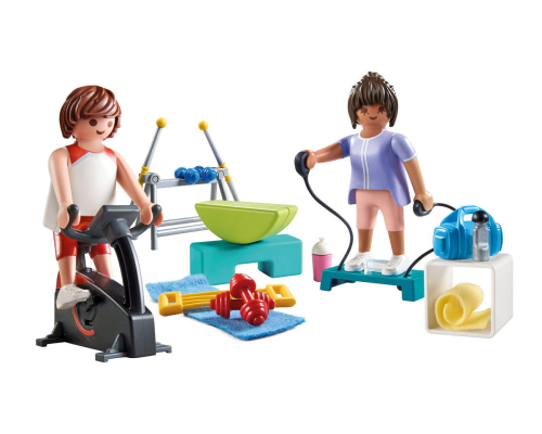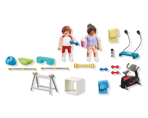 En 1, en 2, en 3! Vandaag staat sport op het programma! Zelfs PLAYMOBIL figuren willen fit blijven. Op de fitnesstraining kan elke spier getraind worden, op de stepper, op het krachttrainingstation of op de hometrainer.