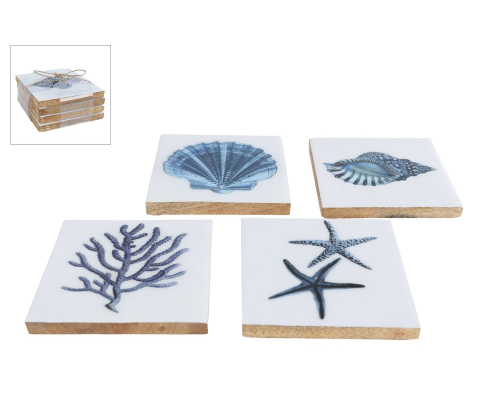 Onderzetter Sea hout emaile 10x10cm set 4 stuks