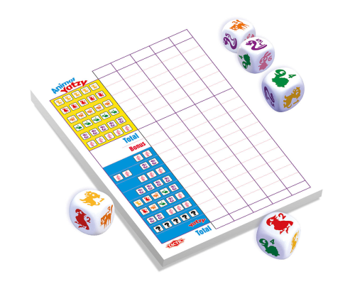 Yatzy met dierenpicto’s en nummers. Volwassenen spelen met de nummers en de allerjongsten alleen met de picto’s . Gooi met jong en oud de beste combinaties met de stenen, vul de score in op het scoreblok en win!_x00D_