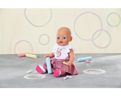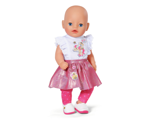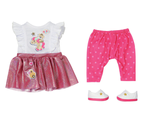 Niets om aan te trekken? Met de doordeweekse outfit voor BABY born Little (36 cm) zit je altijd goed. Je kunt de top combineren met de roze legging met sterrenprint of afzonderlijk dragen als jurk. Bijpassende schoentjes zijn natuurlijk ook inbegrepen. Da