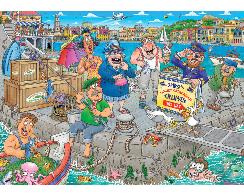 Opa en oma Wasgij genieten van hun langverwachte zomervakantie! Na maanden plannen en sparen hebben ze besloten om zichzelf te trakteren op een luxe catamarancruise. De zon schijnt en de bruisende haven zit vol verrassingen, maar terwijl ze uitkijken naar
