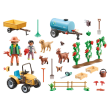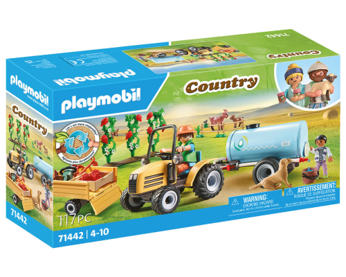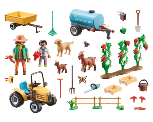 Wanneer de boer naar buiten gaat om zijn velden water te geven, mag zijn hardwerkende jonge helper niet ontbreken. De watertank kan worden gevuld met water en eenvoudig worden vervangen door de aanhanger om de oogst veilig naar huis te brengen.