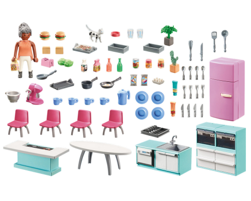 Ga op groot speelplezier met de PLAYMOBIL Keuken met Eethoek. Deze duurzame speelset bevat een PLAYMOBIL-figuur, een volledig uitgeruste keuken en veel realistische accessoires.