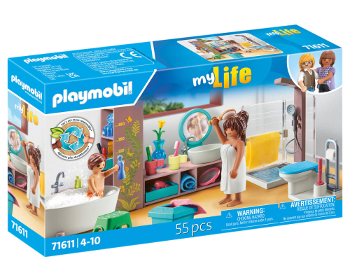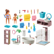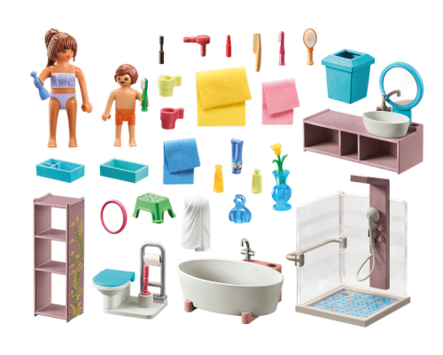 PLAYMOBIL badkamer gemaakt van duurzame materialen, met twee PLAYMOBIL figuren, douche, bad en veel accessoires voor gedetailleerd rollenspel.