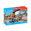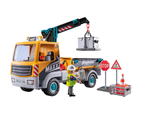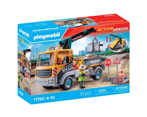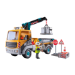 Gelukkig hebben de bouwvakkers hun grote gele vrachtwagen bij zich! Met zijn uitschuifbare en draaibare telescooparm kan hij met gemak alle zware voorwerpen op de bouwplaats heen en weer manoeuvreren.