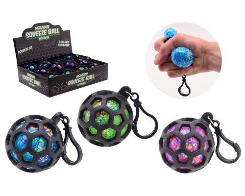 Zeshoekige squeeze glitter bal sleutelhanger, 3 assorti