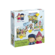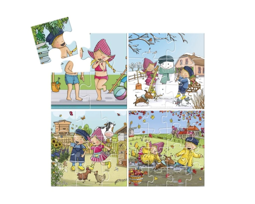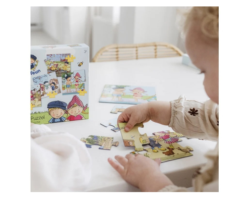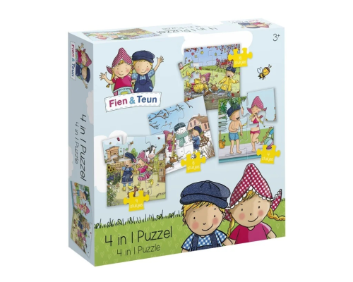 Deze set bestaat uit 4 puzzels met elk een kleurrijke afbeelding uit de serie Fien & Teun, tijdens de verschillende jaargetijden lente, zomer, herfst en winter.