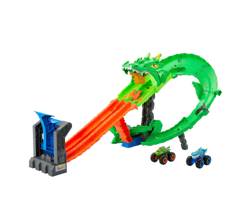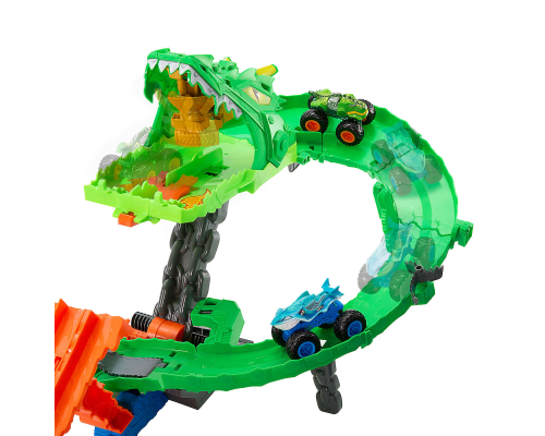 De race gaat van start tussen Hot Wheels Monstertrucks Great Bite en Rageasaur om de vijandelijke draak te verslaan in de Haaien vs. Dino's Draak Vernietiging Speelset. Laad de meegeleverde speelgoedtrucks in de dubbele lanceerder en laat ze zij aan zij r