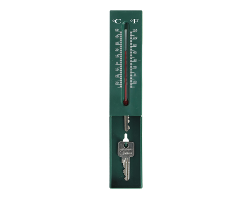 Deze muurthermometer heeft een geheim, de voorkant kan naar boven worden geschoven waardoor twee haken zichtbaar worden die een ideale verstopplaats voor sleutels bieden. De thermometer laat zowel de temperatuur in Celsius (van -30 tot +50) als in Fahrenh