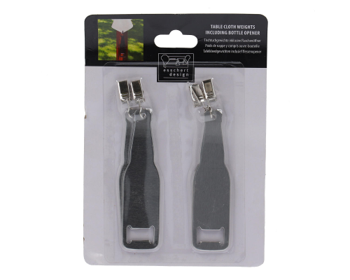 Deze tafelkleedgewichten in de vorm van een fles zorgen ervoor dat het tafelkleed niet opwaait. Ieder gewichtje is voorzien van een flessenopener.