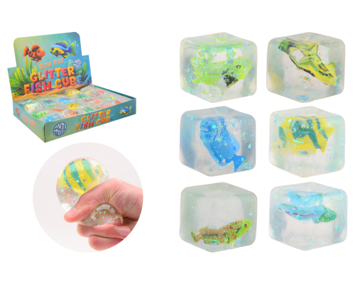 Slow rise glitter kubus met vis - 12 assorti in display