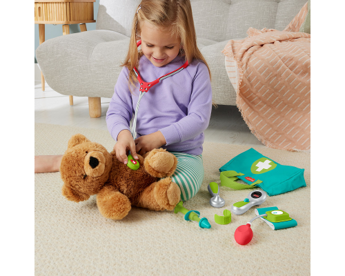 Met de Fisher-Price Doktersset kunnen peuters en kleuters de rol van arts op zich nemen en patiënten 'behandelen' en 'verzorgen'! Deze speelset bevat 7 speelonderdelen voor minidokters, waaronder een stethoscoop om het hart van hun patiënt te 'beluisteren
