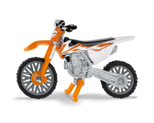 Kapot gereden straten, grindpaden, door de modder en over stenen: dat is het terrein voor de KTM SX-F 450. Met de typische klank van een ééncilinder motor knettert de KTM door onherbergzaam terrein. Het SIKU model in de KTM-kleuren is uitgerust met een b