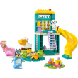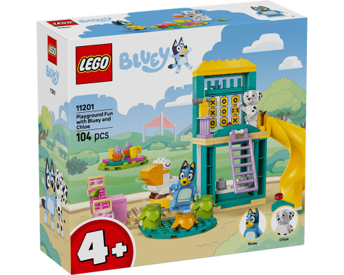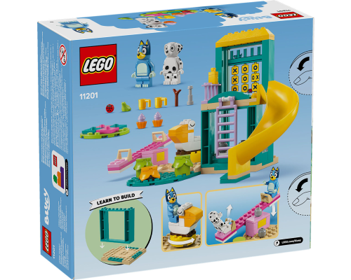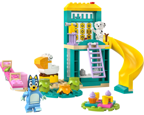 Kinderen vanaf 4 jaar spelen samen met de minifiguren van Bluey en Chloé op een glijbaan, wipwap en andere speeltuintoestellen uit de tv-serie Bluey.