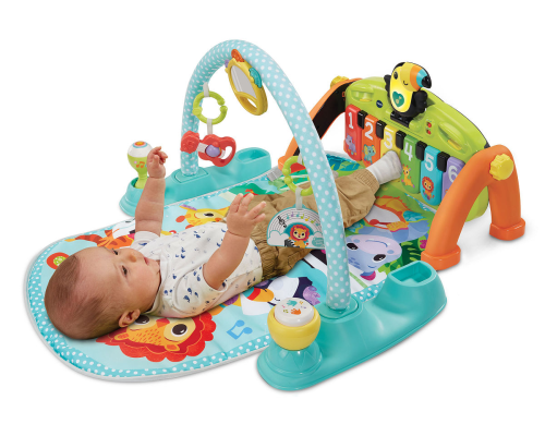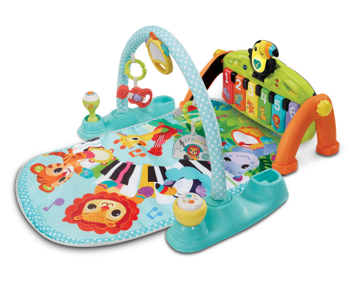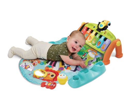 Deze speelmat groeit mee met je baby en laat je kleintje kennismaken met dieren, cijfers, kleuren en muziek. De verschillende materialen en texturen, spiegel, speeltjes en elektronische piano stimuleren de tastzinontwikkeling, de motoriek, het gehoor en h