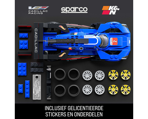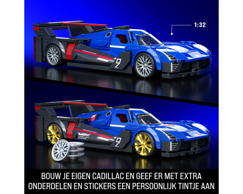 Riemen vast en zet je schrap voor een razendsnelle start met de bouwbare Cadillac Project GTP Hypercar (schaal 1:32) van Mattel Brick Shop. Deze gedetailleerde en authentieke set bevat stickers om je creativiteit de vrije loop te laten, 2 sets wieldoppen,