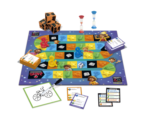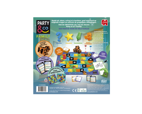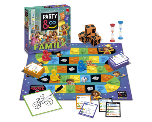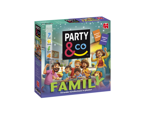 Dit gekke partyspel voor volwassenen en kinderen vanaf 8 jaar is altijd een hit op elk feest of familie bijeenkomst! Het kan gespeeld worden in een kleine of grote groep, omdat het geschikt is voor 4 tot 20 spelers en de gevarieerde taken uit verschillende categorieën zorgen voor urenlang speelplezier en topentertainment. Het is niet te vergelijken met traditionele bordspellen voor kinderen, omdat je in dit quiz - en actie spel tegen elkaar concurreert en unieke en lastige taken uit verschillende categorieën aangaat. Party & Co. is een gek spel dat de beste elementen van de meest vermakelijke bordspellen combineert, zoals tekenen, verboden woorden, uitvinden, of vraag en antwoord. Party & Co. Family is het grappigste partyspel voor het hele gezin! Speel het spel en ga de taken aan in de categorieën tekenen, liplezen, gebarentaal, verboden woorden, en vraag en antwoord. Gooi de dobbelstenen en beweeg je speelstuk over het bord. Voltooi de taken en probeer de vragen correct te beantwoorden. Het team dat als eerste de finishlijn bereikt, wint het spel! Volwassenen kunnen gemakkelijk met kinderen spelen, omdat er twee verschillende moeilijkheidsniveaus in het spel zijn.