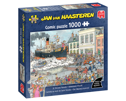 Her - productie van bestaande plaat uit 2017 Een knotsgekke Sinterklaasintocht in de stijl van Jan van Haasteren!De goedheiligman arriveert per stoomboot, precies op het moment dat een enorme golf de haven overspoelt. Het gevolg? Complete chaos; precies zoals je mag verwachten! Over Jan van Haasteren Jan van Haasteren puzzels zijn puzzels met veel kleur en details. Jan van Haasteren tekent al decennia lang humoristische platen die je steeds weer verrassen en laten lachen. De echte fans kennen de specifieke kenmerken van Jan van Haasteren en zoeken in elke puzzel direct naar de haaienvin, Sinterklaas, de handjes, het kunstgebit en Jan’s zelfportret. Jumbo heeft tientallen Jan van Haasteren puzzels in de collectie van 54 tot maar liefst 5.000 puzzelstukjes.