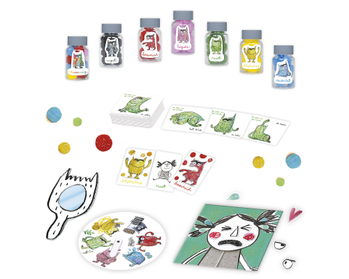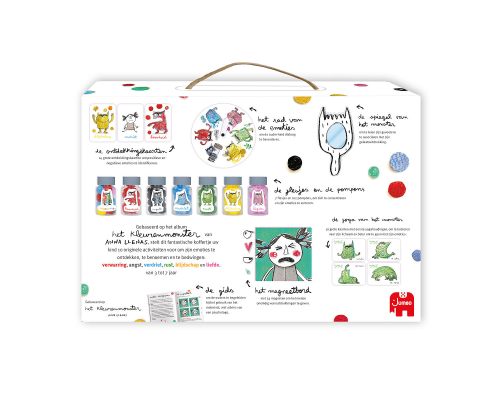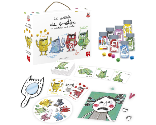 Ik Leer - Ontdekken - Kleurenmonsters Het nieuwe leerspel "Ik ontdek de emoties" uit de succesvolle serie "Ik leer" is ontwikkeld in navolging van het bekende boek "De Kleurenmonsters" van Anna Llenas, in nauwe samenwerking met pedagogen. Het biedt 10 interessante manieren om de emoties woede, angst, verdriet, kalmte, vreugde en liefde te ontdekken en te benoemen. Handig verpakt in een kleine koffer, bevat het 24 grote kaarten, een emotie - draaischijf, een spiegel en zeven containers voor in totaal 120 balletjes in zes verschillende kleuren. Zowel het speelbord als de markeringen zijn magnetisch en voorkomen zo onbedoeld verschuiven. Met de kleine kleurenmonsters duiken kinderen in de kleuterleeftijd op een zowel leuke als speelse manier in de wereld van emoties.