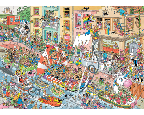 De familie Jan van Haasteren viert het Pride Festival in Amsterdam. Ze genieten van de kleurrijke marsen en sommigen doen zelfs mee aan de grachtenparade. Wat een manier om vrijheid van liefde te vieren. Een Jan van Haasteren puzzel is meer dan een gewone legpuzzel: het is een avonturenserie, met vertrouwde hoofdrolspelers in een eindeloos decor vol absurde details. Ontdek alle doldwaze avonturen van de Jan van Haasteren - familie! We zijn trots dat onze puzzels zijn gemaakt van gerecycled karton in Europa. Om het karton in puzzelstukjes te snijden, gebruiken we het dunste mes dat er is. De puzzel ziet er bijna naadloos uit als hij klaar is. Geniet van deze Jan van Haasteren - puzzel!
