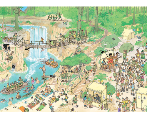 De paden op, de lanen in… De Jan van Haasteren familie bezoekt de prachtige natuur van de jungle. Samen met de andere bezoekers genieten ze volop, hoewel Wendy wat moeite heeft met de brug. Een Jan van Haasteren puzzel is meer dan een gewone legpuzzel: het is een avonturenserie, met vertrouwde hoofdrolspelers in een eindeloos decor vol absurde details. Ontdek alle doldwaze avonturen van de Jan van Haasteren - familie! We zijn trots dat onze puzzels zijn gemaakt van gerecycled karton in Europa. Om het karton in puzzelstukjes te snijden, gebruiken we het dunste mes dat er is. De puzzel ziet er bijna naadloos uit als hij klaar is. Geniet van deze Jan van Haasteren - puzzel!