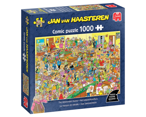 Met deze puzzel nemen we een kijkje in de toekomst, wanneer de Jan van Haasteren familie de senioren leeftijd heeft bereikt. In Het Bejaardentehuis is van alles te doen! Schilderles, potje biljarten of sjoelen en er is een fijn restaurant met heel veel lekkers. Wie wil hier nou niet wonen? Een Jan van Haasteren puzzel is meer dan een gewone legpuzzel: het is een avonturenserie, met vertrouwde hoofdrolspelers in een eindeloos decor vol absurde details. Ontdek alle doldwaze avonturen van de Jan van Haasteren - familie! We zijn trots dat onze puzzels zijn gemaakt van gerecycled karton in Europa. Om het karton in puzzelstukjes te snijden, gebruiken we het dunste mes dat er is. De puzzel ziet er bijna naadloos uit als hij klaar is. Geniet van deze Jan van Haasteren - puzzel!