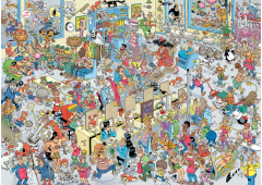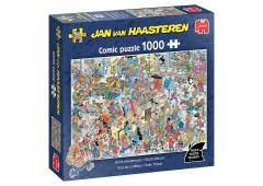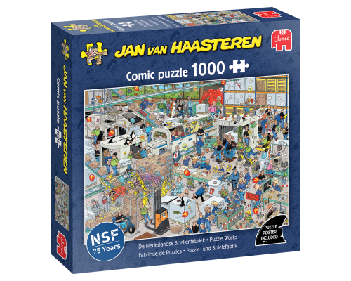 De productie van Jan van Haasteren puzzels is in tien jaar tijd flink veranderd! Dankzij automatisering en slimme robotarmen rolt alles tegenwoordig razendsnel van de band. Alleen… nieuwsgierige schoonmoeders en lopende banden blijken geen goede combinatie. Zelfs Sinterklaas kwam een kijkje nemen om te zien hoe zijn favoriete cadeaus tegenwoordig tot stand komen. Een Jan van Haasteren puzzel is meer dan een gewone legpuzzel: het is een avonturenserie, met vertrouwde hoofdrolspelers in een eindeloos decor vol absurde details. Ontdek alle doldwaze avonturen van de Jan van Haasteren - familie! We zijn trots dat onze puzzels zijn gemaakt van gerecycled karton in Europa. Om het karton in puzzelstukjes te snijden, gebruiken we het dunste mes dat er is. De puzzel ziet er bijna naadloos uit als hij klaar is. Geniet van deze Jan van Haasteren - puzzel!