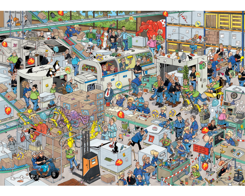 De productie van Jan van Haasteren puzzels is in tien jaar tijd flink veranderd! Dankzij automatisering en slimme robotarmen rolt alles tegenwoordig razendsnel van de band. Alleen… nieuwsgierige schoonmoeders en lopende banden blijken geen goede combinatie. Zelfs Sinterklaas kwam een kijkje nemen om te zien hoe zijn favoriete cadeaus tegenwoordig tot stand komen. Een Jan van Haasteren puzzel is meer dan een gewone legpuzzel: het is een avonturenserie, met vertrouwde hoofdrolspelers in een eindeloos decor vol absurde details. Ontdek alle doldwaze avonturen van de Jan van Haasteren - familie! We zijn trots dat onze puzzels zijn gemaakt van gerecycled karton in Europa. Om het karton in puzzelstukjes te snijden, gebruiken we het dunste mes dat er is. De puzzel ziet er bijna naadloos uit als hij klaar is. Geniet van deze Jan van Haasteren - puzzel!