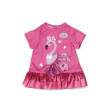 Roze jurk in flamingostijl met ruches en korte mouwen.