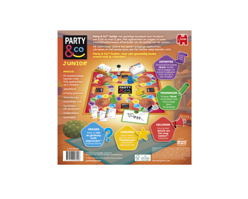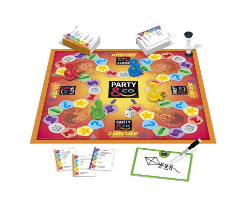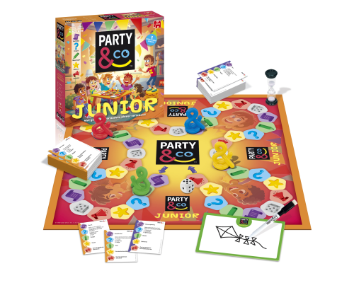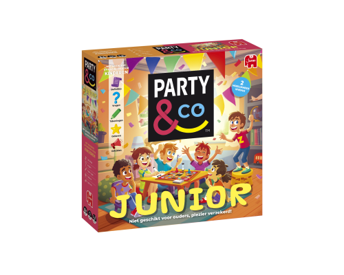 Party & Co Junior, her gezellige bordspel voor kinderen van 8 tot en met 12 jaar. Met opdrachten en vragen in twee moeilijkheidsniveaus afhankelijk van de leeftijd van de spelers. Elk team moet tijdens her spelen grappige opdrachten uitvoeren en het eerste team dat het laatste vakje bereikt, wint. Party & Co Junior, voor een geweldig leuke avond met je vrienden.