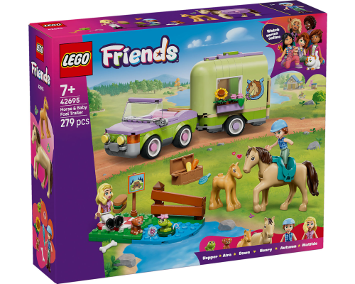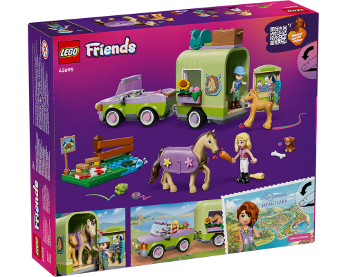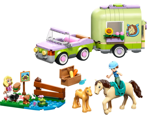 Paardenspeelset met een auto, trailer, paard, veulen, puppy, kikker, 2 minipoppetjes en accessoires waarmee paardenliefhebbers leuke verhalen kunnen bedenken.