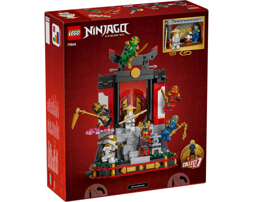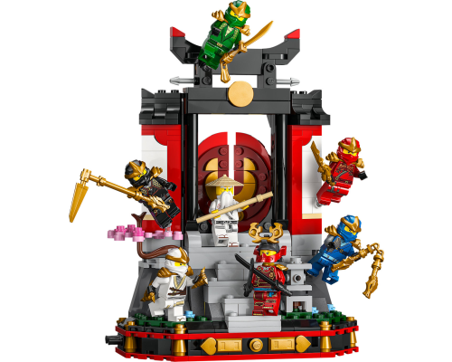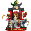 NINJAGO fans kunnen het 15-jarig jubileum van de LEGO NINJAGO tv-serie vieren met deze displaystandaard van een ninjaklooster met 8 minifiguren.