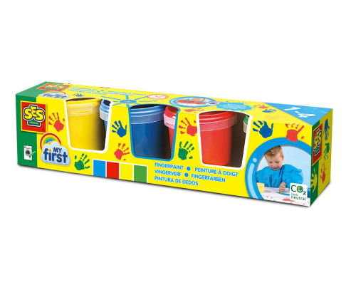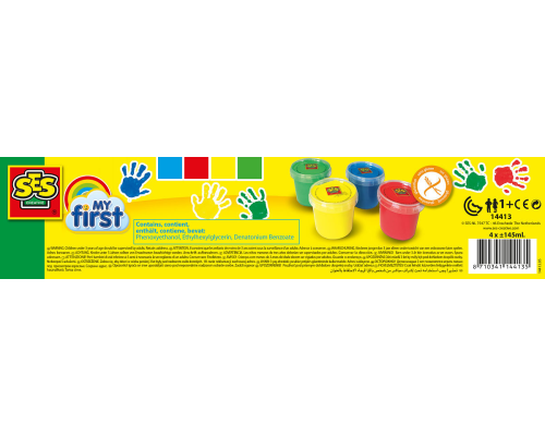 Deze vingerverf van My First bevat de kleuren lichtroze, blauw, geel en groen, waarm