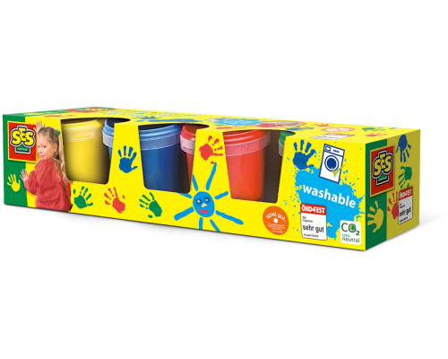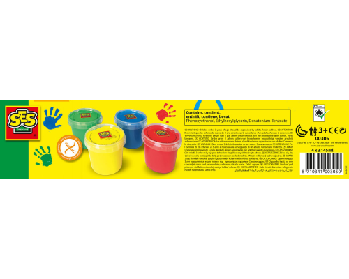 Vingerverf is een van de bekendste productlijnen van SES Creative. De kwaliteit, kleurintensiteit en uitwasbaarheid van de SES vingerverf maken deze onverslaanbaar. Deze vingerverf basic bevat de basiskleuren geel, blauw, rood en groen, waarmee je uren la
