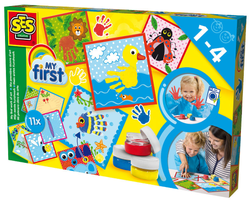 SES Mijn eerste kunstwerk is de perfecte manier voor ouders om hun kindje kennis te laten maken met verf. De set bevat vrolijke voorbedrukte kaarten, waarop staat aangegeven waar je je hand (of voet) kunt plaatsen. Smeer het handje in met verf en plaats h