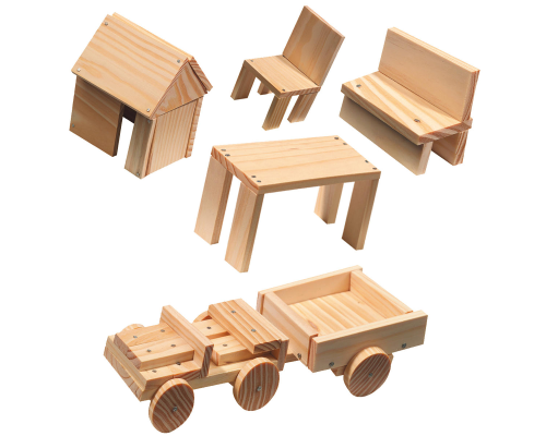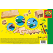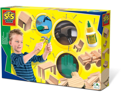 Deze timmerset leert je werken met een echte hamer en spijkers. Met de voorgezaagde houten plankjes in verschillende vormen kun je zelf bedenken wat je wilt timmeren. Door het meegeleverde veiligheidshandje waarmee je de spijkertjes vasthoudt, sla je niet