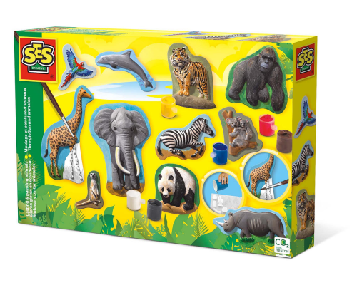 Met deze set van SES maak je 11 dieren van gips. Giet het gips in de mal, laat het drogen en verf het zoals je het zelf leuk vindt. Zo maak je eenvoudig je eigen dierentuin dieren: olifant, dolfijn, zebra, tijger, gorilla, papegaai, neushoorn, panda, koal
