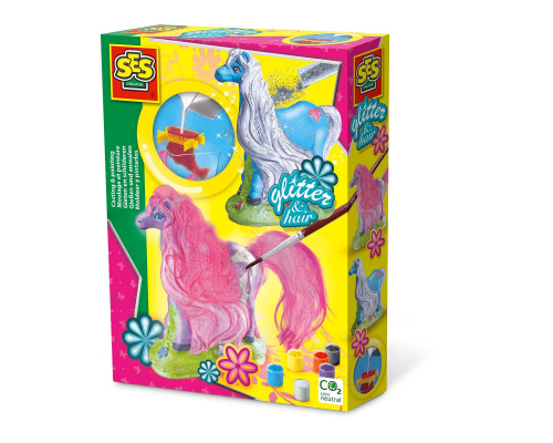 Maak de mooiste beeldwerkjes van gips met SES Creative. Met deze set maak je een mooi paard van gips dat je vervolgens met de bijgeleverde verf beschildert. Het paard wordt nog mooier als je de echte manen erop plakt.