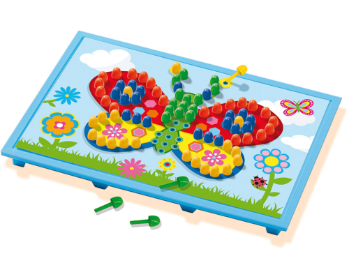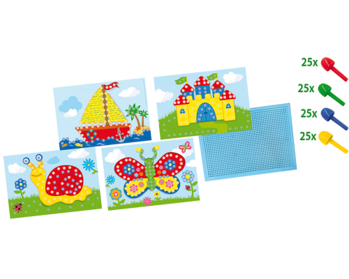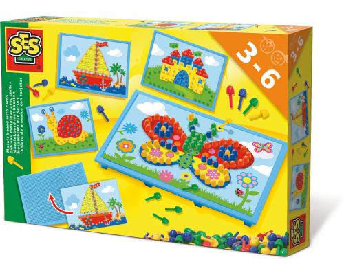 Maak oneindig veel figuren met dit leuke mozaïekbord van SES. De set bevat een heleboel gekleurde pinnetjes in geel, groen, rood en blauw. Leg een kaart op het bord en prik de pinnetjes op de aangegeven plekken. Je kunt het bord natuurlijk ook gebruiken z