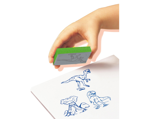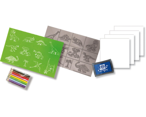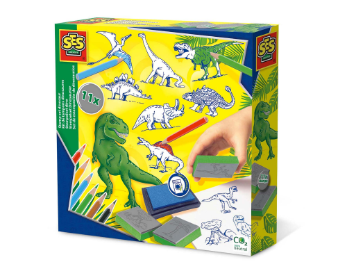 Een leuke stempelset van SES in dinosaurusthema. Met de 11 verschillende stempels en inkt op waterbasis kun je supermooie tekeningen maken. Kleur de dino's in met de bijgevoegde potloden. Droogt de inkt uit? Je kunt hem makkelijk weer activeren met een p