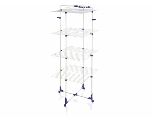 Droogtoren Classic Tower 450 heeft slechts een oppervlakte van 69 x 73 cm nodig. Toch biedt hij met vier droogniveaus boven elkaar een drooglengte van maar liefst 45 meter. Genoeg ruimte dus voor vier tot vijf wasmachineladingen. Zowel het frame als ook i