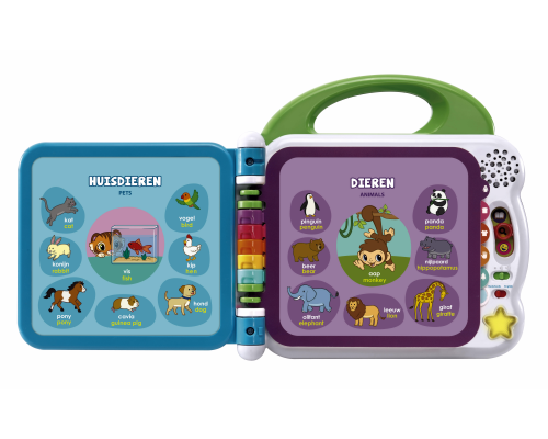 Leer leuke woordjes in zowel het Nederlands als in het Engels door op de plaatjes van de interactieve bladzijden te tikken. Druk op de knipperende ster-toets en zing mee met de vrolijke liedjes. Maak kennis met de dierenvriendjes en speel en leer met ze m